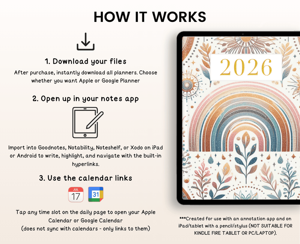 To use the 2026 Digital Planner you will need to have a note taking app such as Goodnotes or Notability (separate app purchase, not included), which is used on an iPad or Tablet.